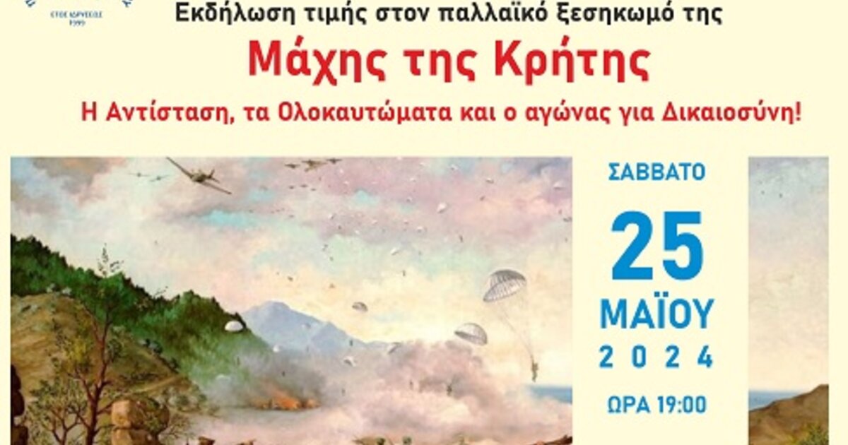 Εκδήλωση τιμής για τη Μάχη της Κρήτης με τίτλο "Η Αντίσταση, τα Ολοκαυτώματα και ο αγώνας για Δικαιοσύνη!" διοργανώνουν η Περιφέρεια Κρήτης και ο Πολιτιστικός Σύλλογος Αγίου Ιωάννη στο Ηράκλειο.
