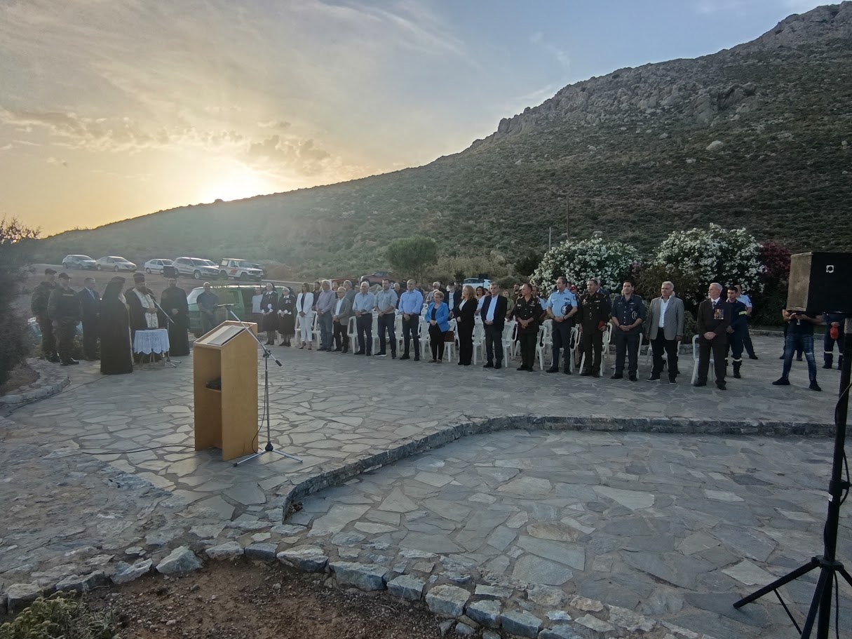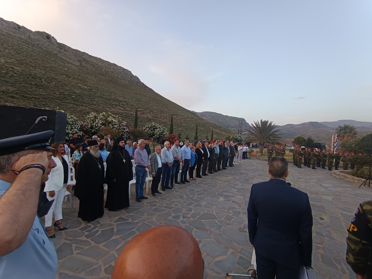 Η τελετή ξεκίνησε με την απόδοση τιμών από τμήμα της 5ης Αερομεταφερόμενης Ταξιαρχίας και τη Φιλαρμονική του Δήμου Ρεθύμνης. Ακολούθησαν επιμνημόσυνη δέηση, χαιρετισμός από εκπρόσωπο του Σεβασμιότατού Μητροπολίτη Λάμπης, Συβρίτου & Σφακίων κ.κ. Ειρηναίου και ομιλία από την Αντιδήμαρχο Πολιτισμού του Δήμου Αγίου Βασιλείου κα Ευαγγελία Γλαμπεδάκη, με θέμα «Η συμβολή της επαρχίας Αγίου Βασιλείου στην περίοδο της Κατοχής».