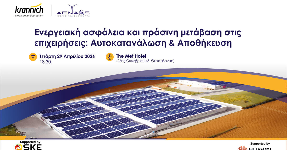 Η εκδήλωση διοργανώνεται από την ΑΕΝΑΟΣ Ενεργειακά Συστήματα, σε συνεργασία με την Krannich Solar Greece και την Huawei, φέρνοντας στο επίκεντρο σύγχρονες ενεργειακές λύσεις που απαντούν στις αυξημένες ανάγκες των επιχειρήσεων.