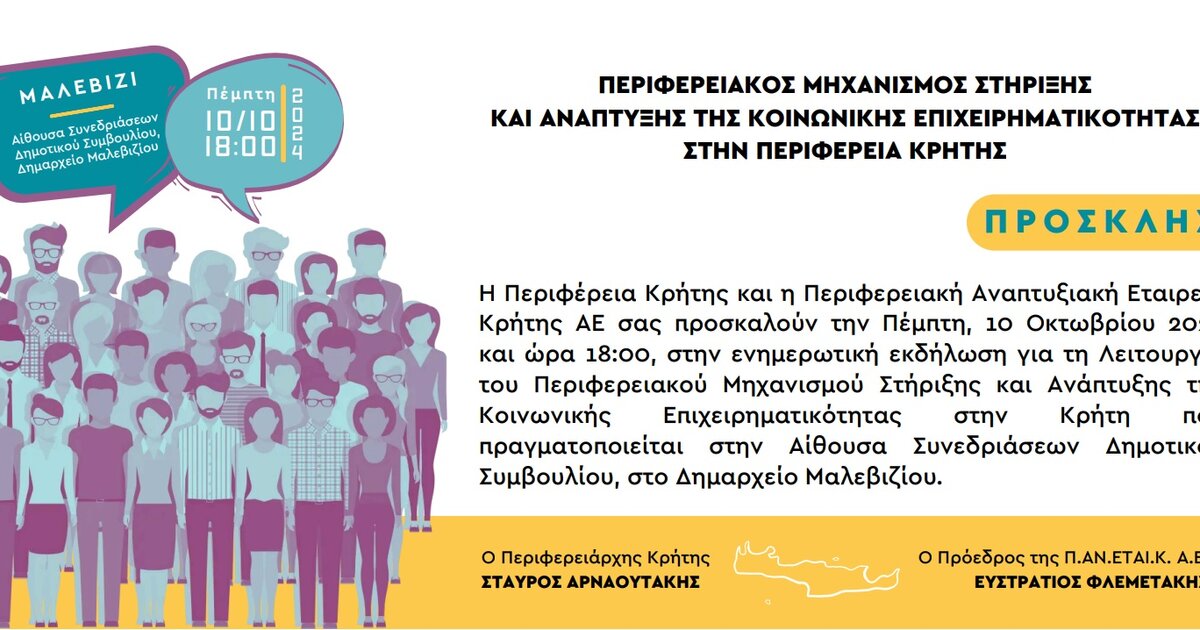 Η Περιφέρεια Κρήτης και η Περιφερειακή Αναπτυξιακή Εταιρεία Κρήτης ΑΕ, στο πλαίσιο του έργου με τίτλο «Λειτουργία Περιφερειακού Μηχανισμού Στήριξης και Ανάπτυξης της Κοινωνικής Επιχειρηματικότητας στην Περιφέρεια Κρήτη» Άξονας Προτεραιότητας 1.3 «Προώθηση αποτελεσμάτων έρευνας, καινοτομίας και τεχνολογίας στις επιχειρήσεις», διοργανώνει ενημερωτική εκδήλωση παρουσίασης του έργου για την ενημέρωση του κοινού και τη διερεύνηση του πεδίου σε όρους ζήτησης, πρόθεσης ενδιαφέροντος και αναγκών ως προς τη δημιουργία Κοινωνικών επιχειρήσεων που θα μπορούσαν να συμβάλουν στον ιδιαίτερο χαρακτήρα και τοπίο κάθε περιοχής καθώς και στις ανάγκες των κατοίκων της και στις ευκαιρίες ανάπτυξής της.