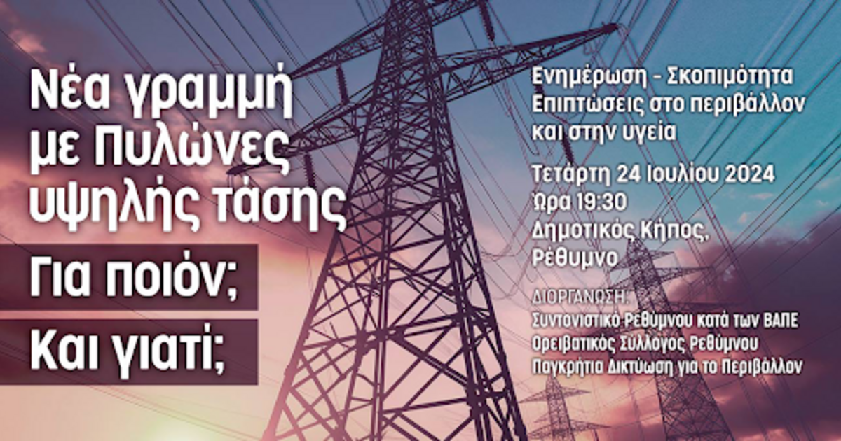 Εκδήλωση συνδιοργανώνουν το Συντονιστικό Ρεθύμνου κατά βΑΠΕ, ο Ορειβατικός Ρεθύμνου και η Παγκρήτια Δικτύωση για το Περιβάλλον, για την σχεδιαζόμενη νέα γραμμή υψηλής τάσης