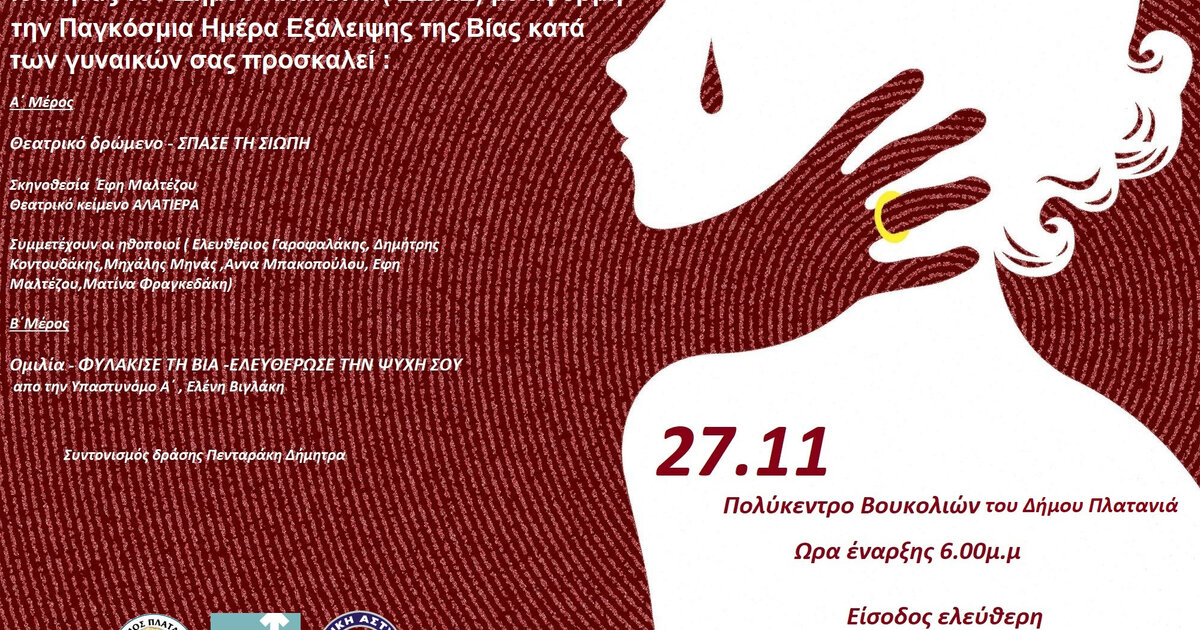 Ο Δήμος Πλατανιά και η Δημοτική Επιτροπή Ισότητας Δήμου Πλατανιά (ΔΕΠΙΣ), διοργανώνουν , με αφορμή την καθιερωμένη Παγκόσμια Ημέρα εξάλειψης της βίας κατά των γυναικών στις 25 Νοεμβρίου, διοργανώνει εκδήλωση ευαισθητοποίησης και αφύπνισης γύρω από το πάντα επίκαιρο ζήτημα της κακοποίησης των γυναικών.
