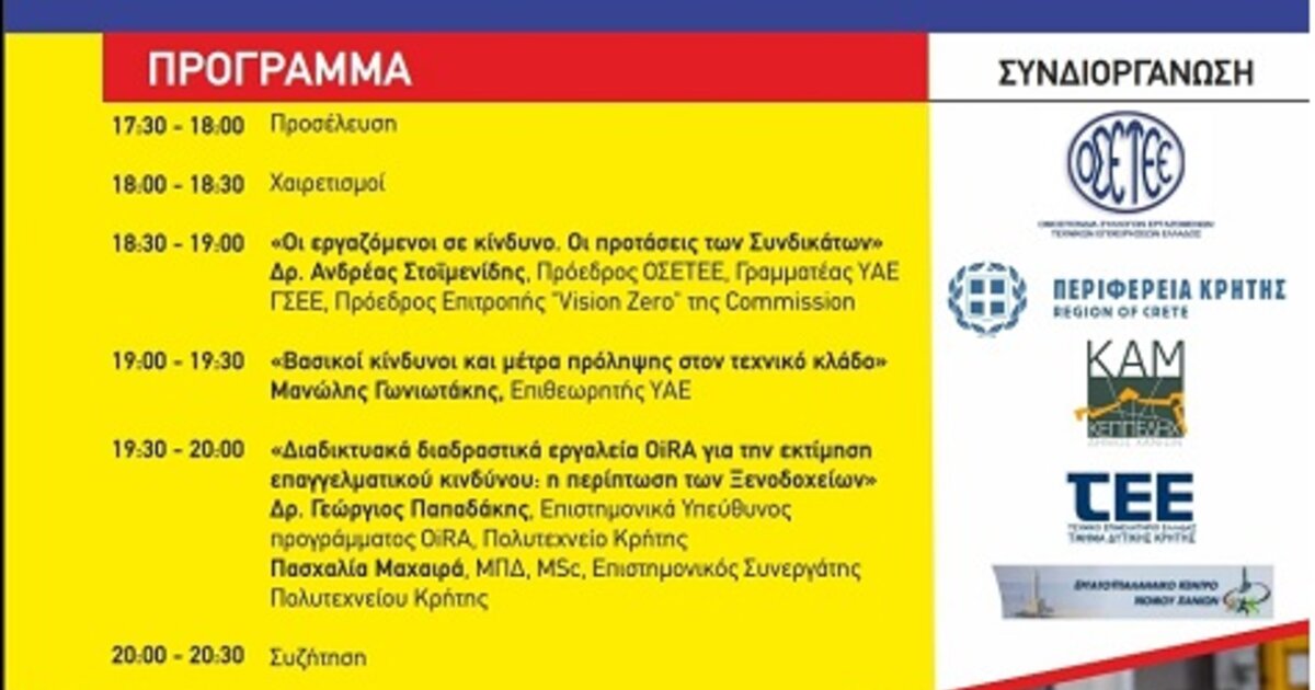 Η Ομοσπονδία Συλλόγων Εργαζομένων Τεχνικών Επιχειρήσεων Ελλάδας και η Περιφέρεια Κρήτης σε συνεργασία με το Εργατικό Κέντρο Χανίων, το ΤΕΕ/ Περιφερειακό Τμήμα Δυτικής Κρήτης,το Κέντρο Αρχιτεκτονικής της Μεσογείου και το Δήμο Χανίων διοργανώνουν μεθαύριο Τετάρτη 19 Οκτωβρίου 2022, στις 18.00 μ.μ στο Κέντρο Αρχιτεκτονικής Μεσογείου, στα Χανιά ενημερωτική εκδήλωση με θέμα «Υγεία και Ασφάλεια στην Εργασία».