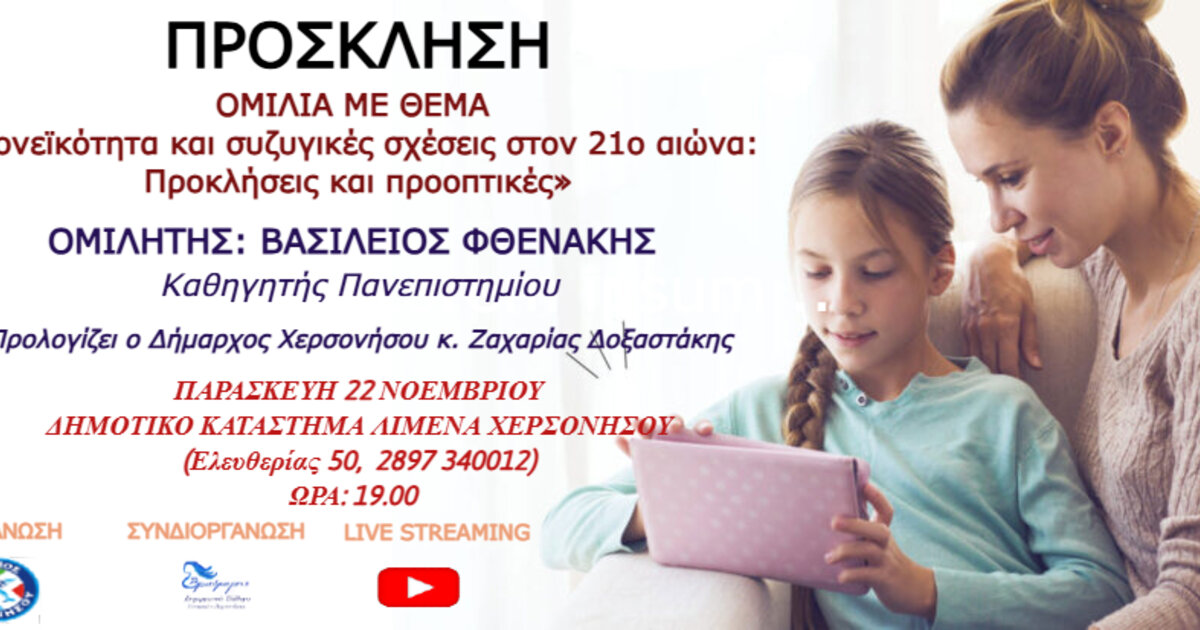 «Γονεϊκότητα και συζυγικές σχέσεις στον 21ο αιώνα: Προκλήσεις και προοπτικές» είναι ο τίτλος της εκδήλωσης που διοργανώνεται στον Δήμο Χερσονήσου με κεντρικό ομιλητή τον καθηγητή Πανεπιστημίου κ. Βασίλειο Φθενάκη.