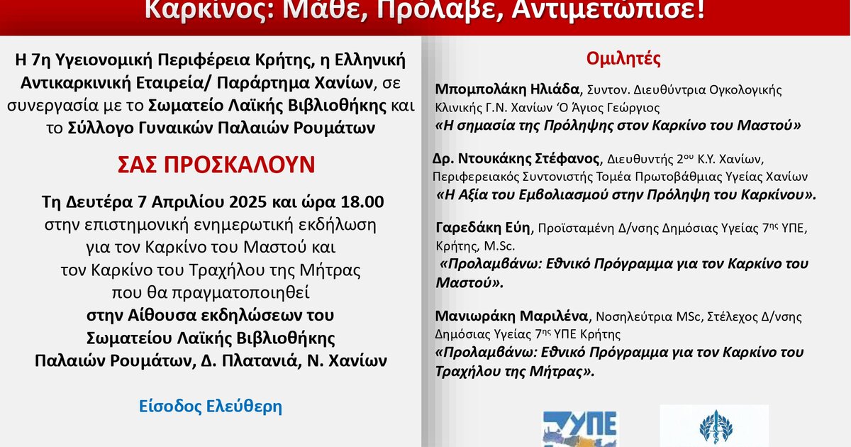 Την Δευτέρα 7 Απριλίου 2025 και ώρα 18:00 το απόγευμα, στην αίθουσα εκδηλώσεων του Σωματείου Λαϊκής Βιβλιοθήκης Παλαιών Ρουμάτων του Δήμου Πλατανιά, στα Χανιά, θα πραγματοποιηθεί, ανοιχτή για το κοινό, επιστημονική ενημερωτική εκδήλωση για τον καρκίνο.