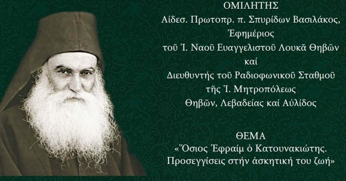 Κεντρικός ομιλητής ο Αιδ. Πρωτοπρεσβύτερος π. Σπυρίδων Βασιλάκος, Εφήμεριος του Ι. Ναού Ευαγγελιστού Λουκά Θηβών, Διευθυντής Ραδιοφωνικού Σταθμού Ι.Μ. Θηβών, Λεβαδείας και Αυλίδος, ο οποίος θα μιλήσει με θέμα: «Όσιος Εφραίμ ο Κατουνακιώτης. Προσεγγίσεις στην ασκητική του ζωή».
