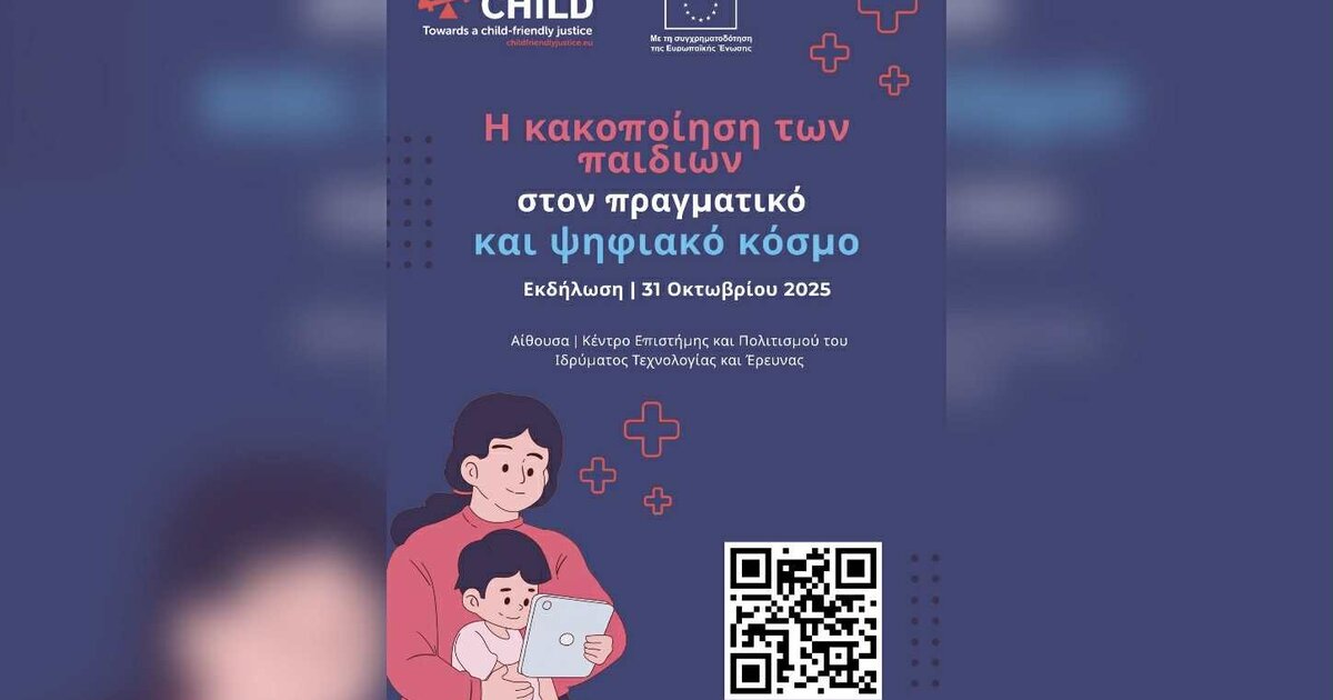 Η εκδήλωση, που θα πραγματοποιηθεί την Παρασκευή 31 Οκτωβρίου 2025, στις 12 το μεσημέρι στο Κέντρο Επιστήμης και Πολιτισμού του Ιδρύματος Τεχνολογίας και Έρευνας (οδοί Αβέρωφ και Ζωγράφου) στο Ηράκλειο, στοχεύει να φέρει στο προσκήνιο τα ζητήματα της κακοποίησης του παιδιού, τόσο στον φυσικό κόσμο όσο και στον ψηφιακό (διαδίκτυο, κοινωνικά δίκτυα, ψηφιακές εφαρμογές).