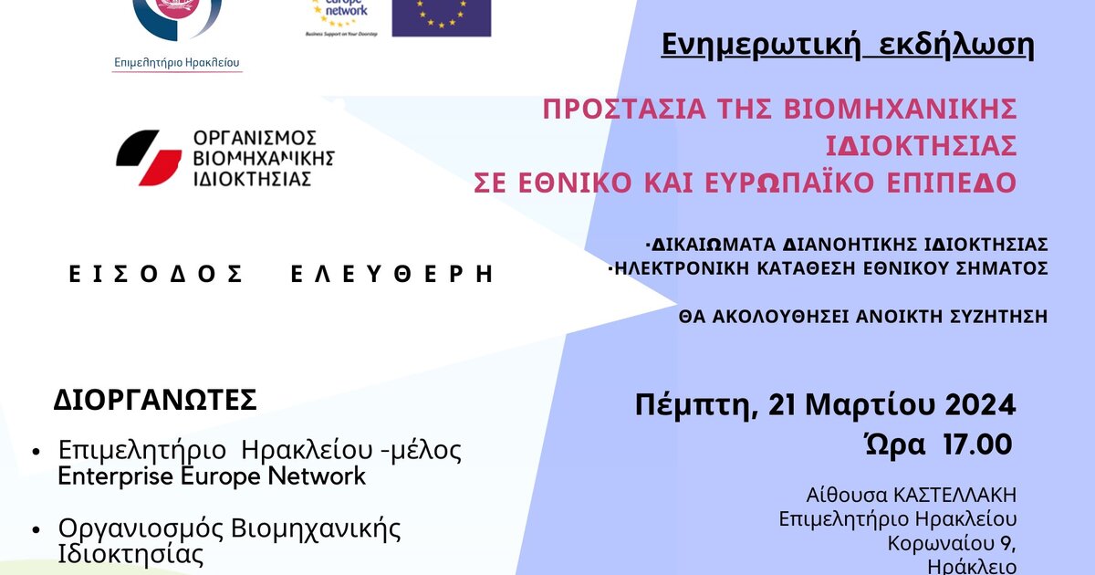 Το Επιμελητήριο Ηρακλείου - μέλος του Enterprise Europe Network - και ο Οργανισμός Βιομηχανικής Ιδιοκτησίας διοργανώνουν εσπερίδα με θέμα: «Προστασία της Βιομηχανικής Ιδιοκτησίας σε Εθνικό και Ευρωπαϊκό Επίπεδο», αύριο Πέμπτη 21 Μαρτίου 2024 στις 17:00 μ.μ, στην αίθουσα Καστελλάκη του Επιμελητηρίου Ηρακλείου.