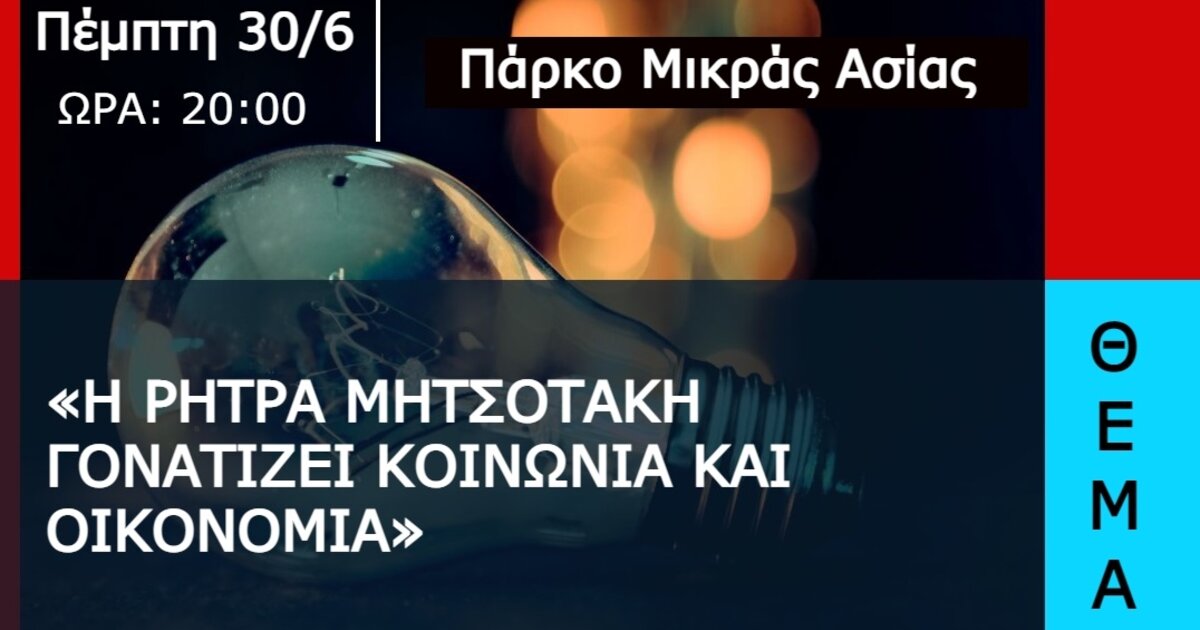 Πολιτική εκδήλωση, με θέμα «Η ρήτρα Μητσοτάκη γονατίζει κοινωνία και οικονομία» θα πραγματοποιηθεί την Πέμπτη, 30 Ιουνίου, στις 8 μ.μ. στο Πάρκο Μικράς Ασίας του Ηρακλείου. Κεντρικός ομιλητής της εκδήλωση θα είναι ο τομεάρχης Περιβάλλοντος και Ενέργειας του ΣΥΡΙΖΑ-ΠΣ και βουλευτής Β’ Θεσσαλονίκης Σωκράτης Φάμελλος, ο οποίος θα πραγματοποιήσει διήμερη επίσκεψη στο Ηράκλειο.