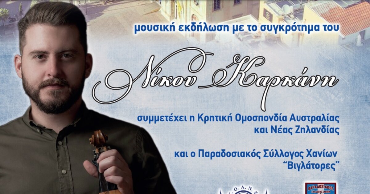 Με αφορμή, λοιπόν, την παρουσία της Κρητικής Ομοσπονδίας Αυστραλίας και Ν. Ζηλανδίας στα Χανιά διοργανώνουμε εκδήλωση την Πέμπτη 13 Ιουλίου 2023 και ώρα 8 μ.μ. στην Πλατεία Μητροπόλεως.