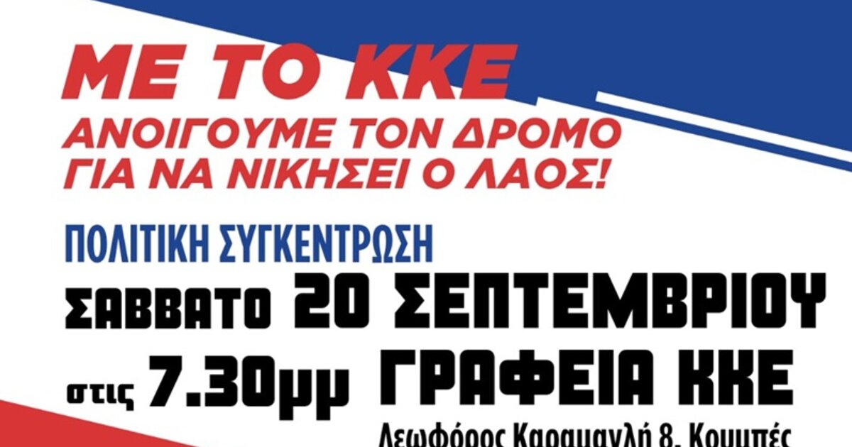 Η Τομεακή Επιτροπή Χανίων του ΚΚΕ διοργανώνει πολιτική συγκέντρωση το Σάββατο 20 Σεπτεμβρίου στις 7.30μ.μ. στα Γραφεία του Κόμματος στον Κουμπέ