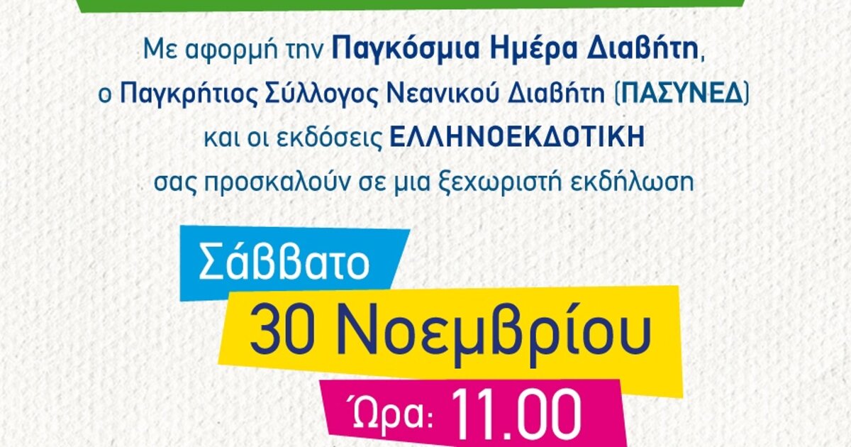 Σε συνέχεια των εορτασμών του Παγκρήτιου Συλλόγου Νεανικού Διαβήτη (ΠΑΣΥΝΕΔ) για την Παγκόσμια ημέρα Διαβήτη (14 Νοεμβρίου), Ο Σύλλογος και οι εκδόσεις Ελληνοεκδοτική διοργανώνουν το Σάββατο 30 Νοεμβρίου και ώρα 11:00 στο Πολύκεντρο Νεολαίας Ηρακλείου, εκδήλωση αφιερωμένη στο Διαβήτη.