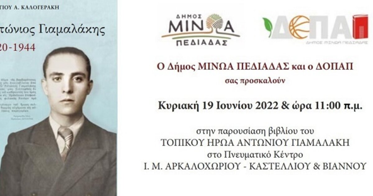 Η εκδήλωση θα πραγματοποιηθεί την Κυριακή 19 Ιουνίου, στο Αρκαλοχώρι του Δήμου Μινώα Πεδιάδας, με την παρουσίαση του βιβλίου με τίτλο: «Αντώνιος Γιαμαλάκης 1920-1944», αφιερωμένο στη ζωή και τη δράση του τοπικού ήρωα της Εθνικής Αντίστασης Αντωνίου Γιαμαλακη, στο Πνευματικό Κέντρο της Ι.Μ Αρκαλοχωρίου, Καστελλίου και Βιάννου στις 11 π.μ.