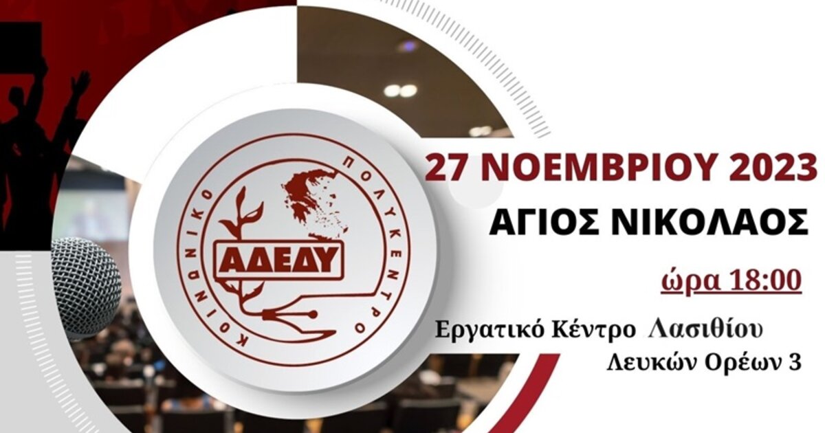 Η Εκτελεστική Γραμματεία του Νομαρχιακού Τμήματος Λασιθίου της ΑΔΕΔΥ σε συνεργασία με το Κοινωνικό Πολύκεντρο και την Εκτελεστική Επιτροπή της ΑΔΕΔΥ συνδιοργανώνουν εκδήλωση τη Δευτέρα 27 Νοεμβρίου και ώρα 18:00 στον Άγιο Νικόλαο. Η εκδήλωση θα πραγματοποιηθεί στην αίθουσα εκδηλώσεων του Εργατικού Κέντρου Λασιθίου (Λευκών Ορέων 3) με θέμα «Αμοιβές και Συνταξιοδοτικό Ζήτημα στον Δημόσιο τομέα».
