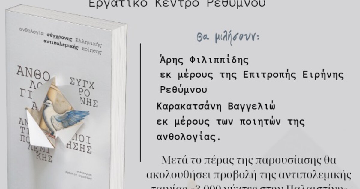 Η Επιτροπή Ειρήνης Ρεθύμνου στα πλαίσια της Αντιιμπεριαλιστικής Ημέρας Δράσης και οι εκδόσεις Κυβέρτι παρουσιάζουν την ανθολογία σύγχρονης ελληνικής αντιπολεμικής ποίησης, την Κυριακή 21 Απρίλη 2024 στις 7 το απόγευμα στο Εργατικό Κέντρο Ρεθύμνου.
