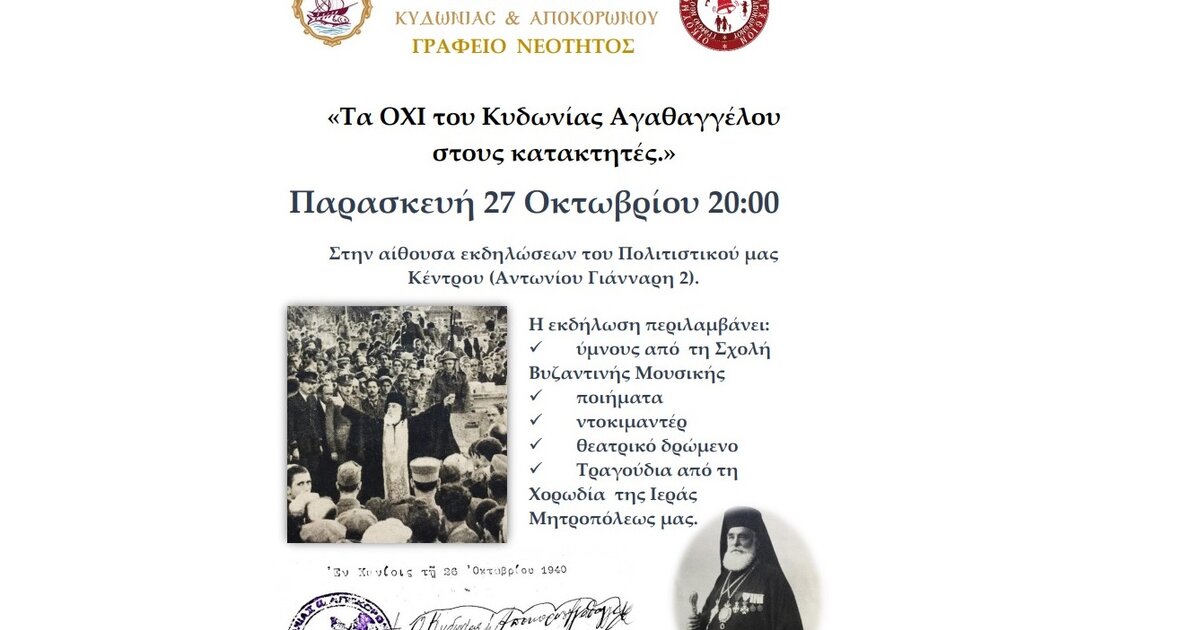 Η Ιερά Μητρόπολη Κυδωνίας και Αποκορώνου δια του Γραφείου Νεότητας αυτής σας προσκαλεί σε εκδήλωση για την Εθνική Εορτή της 28ης Οκτωβρίου με θέμα : «Τα ΟΧΙ του Κυδωνίας Αγαθαγγέλου στους Κατακτητές».