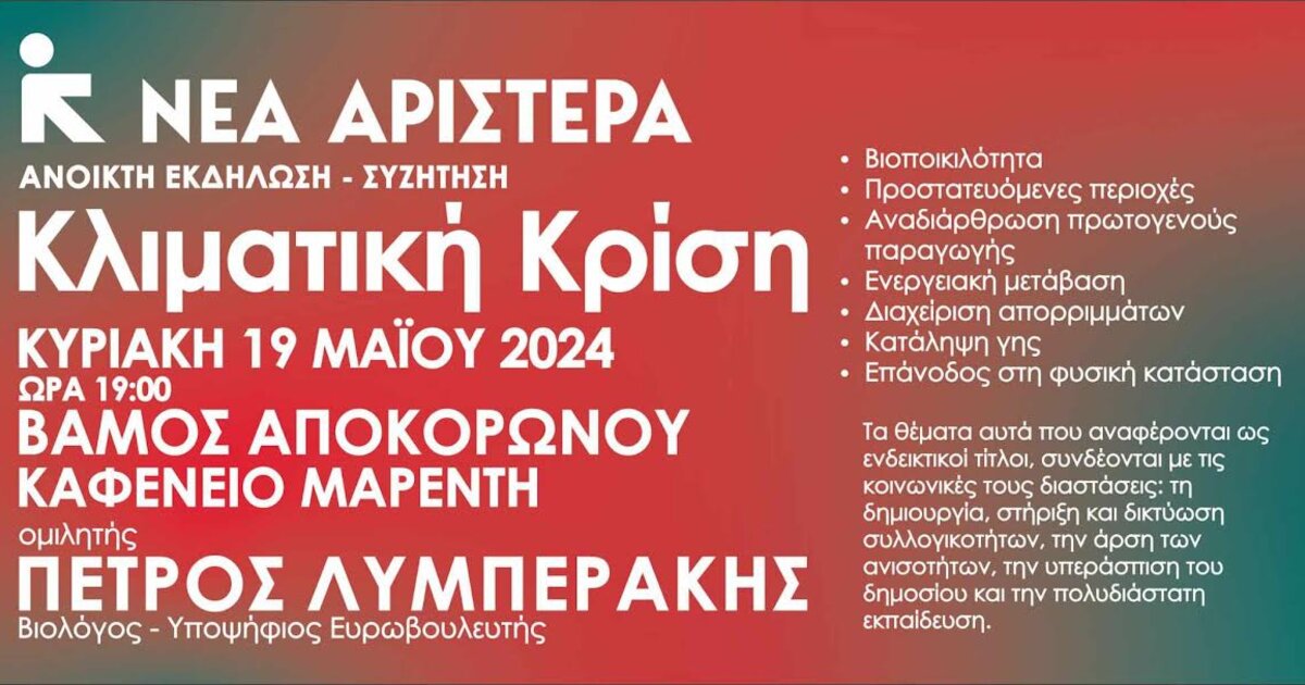 Εκδήλωση – συζήτηση με θέμα την Κλιματική Κρίση και κεντρικό ομιλητή τον υπ. Ευρωβουλευτή της Νέας Αριστεράς Πέτρο Λυμπεράκη θα πραγματοποιηθεί την Κυριακή 19 Μαΐου κι ώρα 19:00 στον Βάμο Αποκορώνου ( καφενείο Μαρέντη).