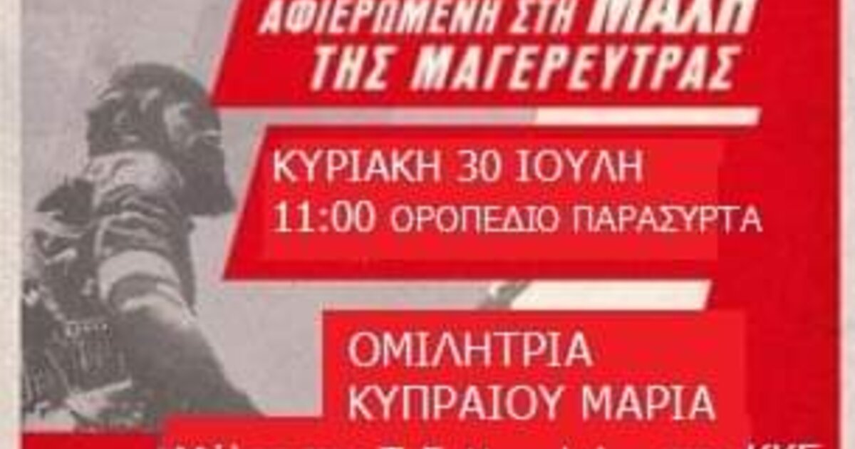 Η Τομεακή Επιτροπή Ηρακλείου του ΚΚΕ διοργανώνει την Κυριακή 30 Ιούλη στις 11:00, στο Οροπέδιο Παράσυρτα, στην Έμπαρο, Εκδήλωση αφιερωμένη στη Μάχη της Μαγερεύτρας που έγινε ανάμεσα στους μαχητές του ΔΣΕ και του παρακρατικούς των Μπαντουβάδων, με ομιλήτρια τη Μαρία Κυπραίου, μέλος του Τομεακού Γραφείου Ηρακλείου του ΚΚΕ.
