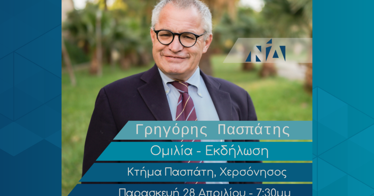 Η εκδήλωση πραγματοποιείται την προσεχή Παρασκευή 28 Απριλίου και ώρα 7:30μμ στο Κτήμα Πασπάτη, στη Χερσόνησο. Μετά την τοποθέτηση του Γρηγόρη Πασπάτη θα ακολουθήσει συζήτηση με πολίτες και επαγγελματίες της περιοχής για τα θέματα που τους απασχολούν.