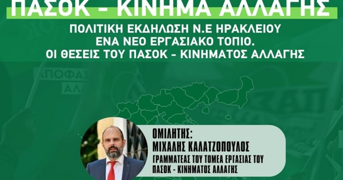 Αύριο, Σάββατο 10 Ιουνίου, στις 11:00 το πρωί, στην αίθουσα του Εργατικού Κέντρου Ηρακλείου θα πραγματοποιηθεί η πολιτική εκδήλωση του ΠΑΣΟΚ-Κινήματος Αλλαγής με θέμα: «Ένα νέο εργασιακό τοπίο. Οι θέσεις του ΠΑΣΟΚ-Κινήματος Αλλαγής».