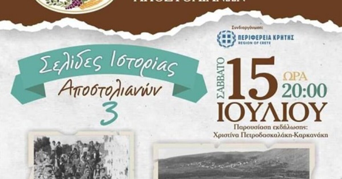 Σε μία προσπάθεια να φωτιστούν ιστορικές περίοδοι της τοπικής ιστορίας, συμβάλλοντας στη διατήρηση της ιστορικής μνήμης με τη στήριξη της περιφέρειας και την πολύτιμη βοήθεια του Γεωργίου Καλογεράκη ο πολιτιστικός σύλλογος Αποστολιανών πραγματοποιεί ημερίδα και παρουσιάζει στοιχεία που αφορούν την περίοδο της Γερμανικής κατοχής 1941-1945.
