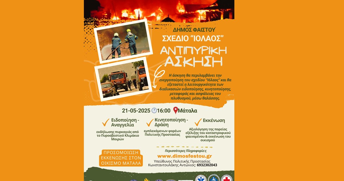 Ο Δήμος Φαιστού και η Υπηρεσία Πολιτικής Προστασίας, ανακοινώνουν τη διεξαγωγή μεγάλης κλίμακας αντιπυρικής άσκησης προσομοίωσης εκκένωσης στον οικισμό Ματάλων, την Τετάρτη 21 Μαΐου 2025 και ώρα 16:00, στο πλαίσιο της προετοιμασίας για την αντιπυρική περίοδο και την ενίσχυση του επιπέδου ετοιμότητας όλων των εμπλεκόμενων φορέων.