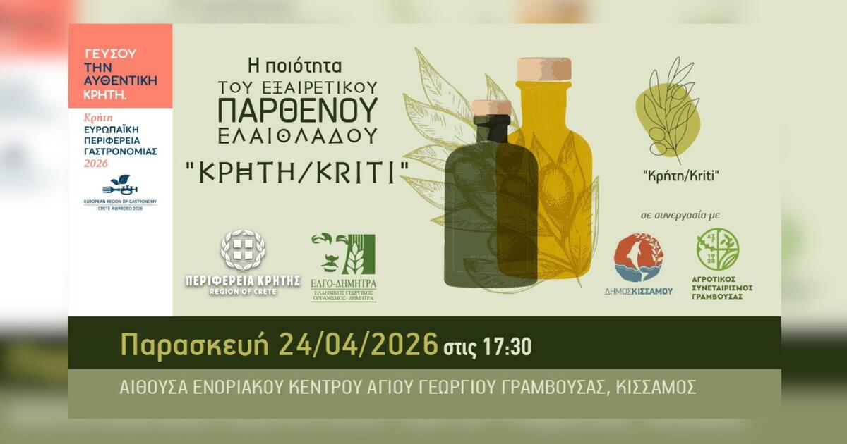 Η Περιφέρεια Κρήτης και ο Ελληνικός Γεωργικός Οργανισμός-ΔΗΜΗΤΡΑ (ΕΛΓΟ-ΔΗΜΗΤΡΑ), σε συνεργασία με το Δήμο Κισσάμου και τον Αγροτικό Συνεταιρισμό Γραμβούσας, διοργανώνουν εσπερίδα για την ποιότητα του Εξαιρετικού Παρθένου Ελαιόλαδου “Κρήτη/Kriti”, η οποία θα πραγματοποιηθεί την Παρασκευή 24 Απριλίου 2026 στις 17:30 μ.μ στην Αίθουσα Ενοριακού Κέντρου Αγίου Γεωργίου Γραμβούσας στην Κίσσαμο. Την εκδήλωση υποστηρίζουν οι: Σύνδεσμος Εξαγωγέων Κρήτης, Σύνδεσμος Τυποποιητών Ελαιολάδου Κρήτης, Σύνδεσμος Ελαιοκομικών Δήμων Κρήτης, Δίκτυο Κρητικού Ελαιολάδου και ο Σύλλογος Ιδιοκτητών Ελαιουργείων Ν. Χανίων.