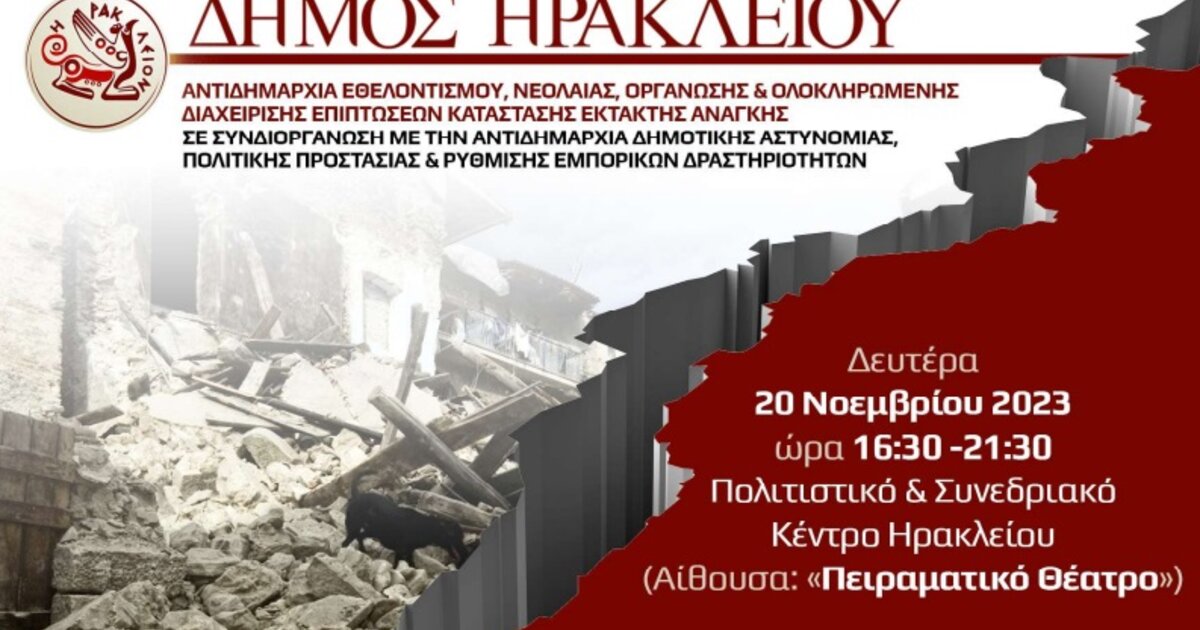 O Δήμος Ηρακλείου δια της Αντιδημαρχίας Εθελοντισμού, Νεολαίας, Οργάνωσης & Ολοκληρωμένης Διαχείρισης Επιπτώσεων Κατάστασης Έκτακτης Ανάγκης διοργανώνει επιμορφωτικό σεμινάριο εθελοντών τη Δευτέρα 20/11/2023 στο Πολιτιστικό και Συνεδριακό Κέντρο Ηρακλείου με θέμα «Εκπαίδευση στην Αντιμετώπιση και Προστασία σε Περίπτωση Σεισμού».