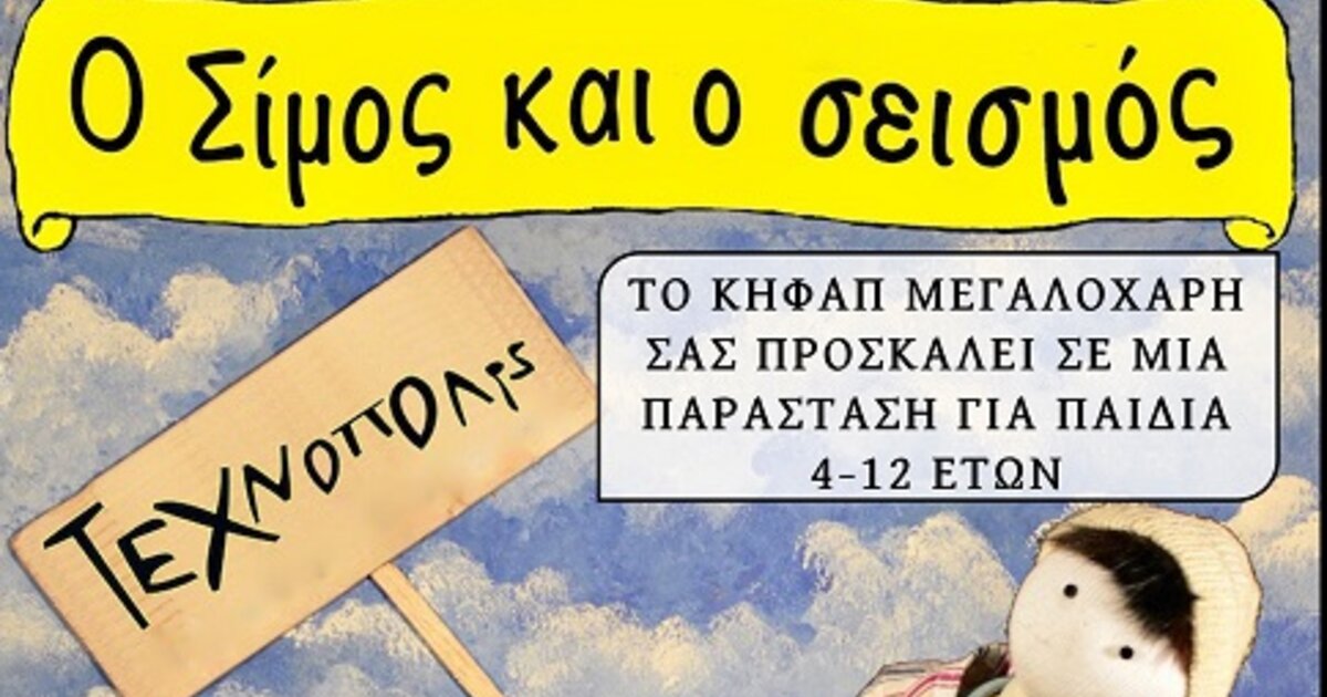 Το ΚΗΦΑΠ Μεγαλόχαρη, σε συνεργασία με την Περιφέρεια Κρήτης, ανεβάζει παράσταση από το Εκπαιδευτικό Θέατρο Τεχνόπολις «Ο Σίμος και ο σεισμός», το Σάββατο 01 Ιουλίου 2023 και ώρα 19:30, στο Πνευματικό Κέντρο Χανίων, για την ενίσχυση των δράσεων του ΚΗΦΑΠ Μεγαλόχαρη.