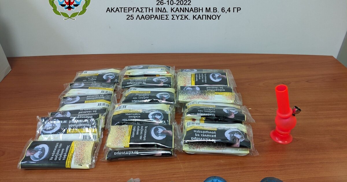 Ειδικότερα, σε έλεγχο που διενεργήθηκε στον ανωτέρω κατά την αποβίβαση από Ε/Γ-Ο/Γ πλοίο στον οικείο λιμένα και μετά από ένδειξη αστυνομικού σκύλου ανίχνευσης ναρκωτικών ουσιών Λ.Σ.-ΕΛ.ΑΚΤ., βρέθηκε να κατέχει εντός αποσκευής, επιμελώς κρυμμένες μέσα σε κάλτσα, τρεις αυτοσχέδιες νάιλον συσκευασίες περιέχουσες ακατέργαστη ινδική κάνναβη, συνολικού μικτού βάρους 6,4 γραμμαρίων. Επιπρόσθετα, εντός της αποσκευής βρέθηκαν ένας πλαστικός θρυμματιστής με υπολείμματα κάνναβης, μία πλαστική συσκευή καπνίσματος κάνναβης καθώς και 25 συσκευασίες καπνού, των 50 γραμμαρίων έκαστη, στερούμενες στο σύνολό τους τελωνειακού ελέγχου και σήμανσης.