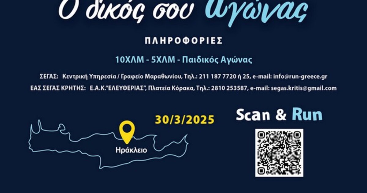 Με απόφαση της Αστυνομικής Διεύθυνσης Ηρακλείου την ερχόμενη Κυριακή 30.03.2025 από τις 07:30 το πρωί έως τις 14:00 μετά το μεσημέρι, θα ισχύσουν έκτακτες κυκλοφοριακές ρυθμίσεις στην πόλη του Ηρακλείου λόγω της διεξαγωγής του αγώνα δρόμου με την επωνυμία «RUN GREECE ΗΡΑΚΛΕΙΟ 2025».