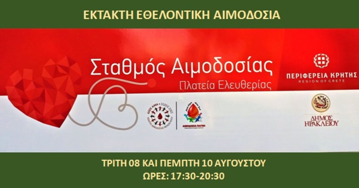 Το Πανεπιστημιακό Νοσοκομείο Ηρακλείου μέσα στο πλαίσιο της διαρκούς προσπάθειάς για επάρκεια αίματος κατά τη διάρκεια των θερινών μηνών, οργανώνει έκτακτη καλοκαιρινή εθελοντική αιμοδοσία, την Τρίτη 8 και Πέμπτη 10 Αυγούστου στο Σταθμό Αιμοδοσίας της Πλατείας Ελευθερίας (17:30-20:30).