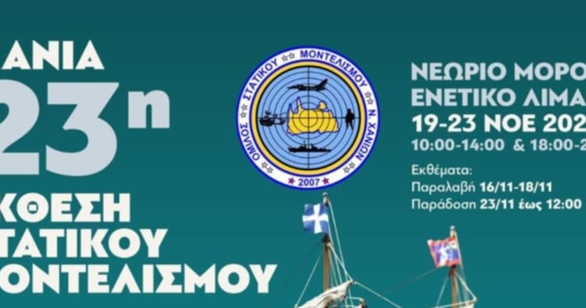Ο Όμιλος Στατικού Μοντελισμού Χανίων, διοργανώνει την 23η Ετήσια Έκθεση Στατικού Μοντελισμού με την Υποστήριξη της Περιφερειακής Ενότητας Χανίων και του Δήμου Χανίων, υπό την Αιγίδα του Ναυτικού Μουσείου Κρήτης.