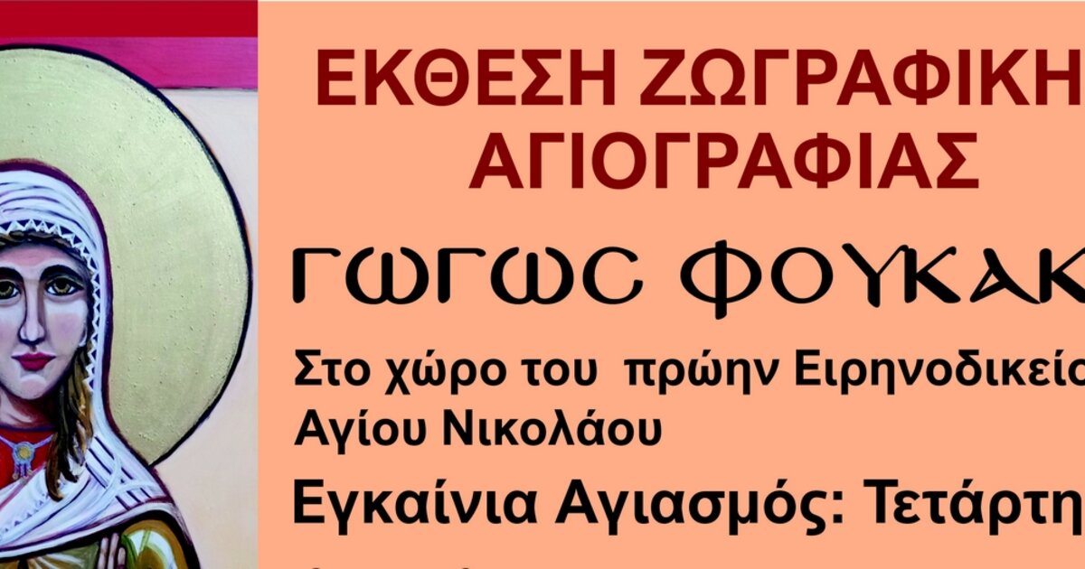 Ο Δήμος Αγίου Νικολάου σας καλεί στα εγκαίνια της έκθεσης ζωγραφικής αγιογραφίας της Γωγώς Φουκάκη με τίτλο : «Χώρος-Χρόνος-Χρώμα-Πρόσωπα του κόσμου» που θα πραγματοποιηθεί την Τετάρτη 15 Οκτωβρίου 2025 στο κτίριο του «Ειρηνοδικείου» Αγίου Νικολάου.
