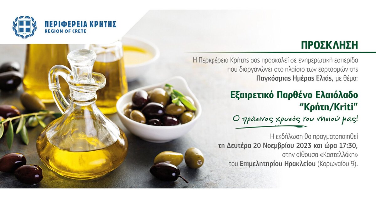 Η Περιφέρεια Κρήτης διοργανώνει στο πλαίσιο της Παγκόσμιας Ημέρας Ελιάς ενημερωτική εσπερίδα αφιερωμένη στο εξαιρετικό παρθένο ελαιόλαδο «Κρήτη/Kriti» με θέμα «Εξαιρετικό Παρθένο Ελαιόλαδο «Κρήτη/Kriti», ο πράσινος χρυσός του νησιού μας» τη Δευτέρα 20 Νοεμβρίου 2023 και ώρα 17:30, στην αίθουσα «Καστελλάκη» του Επιμελητηρίου Ηρακλείου (Κορωναίου αρ. 9).