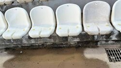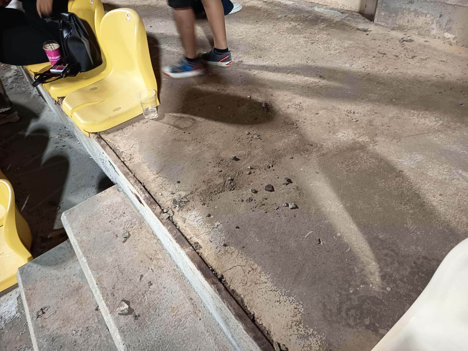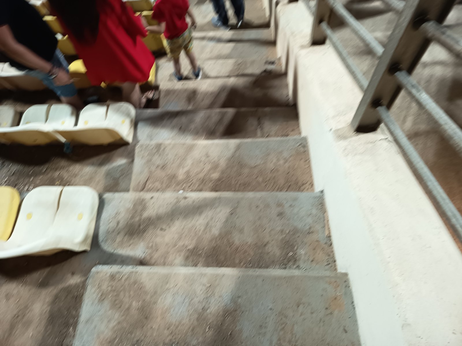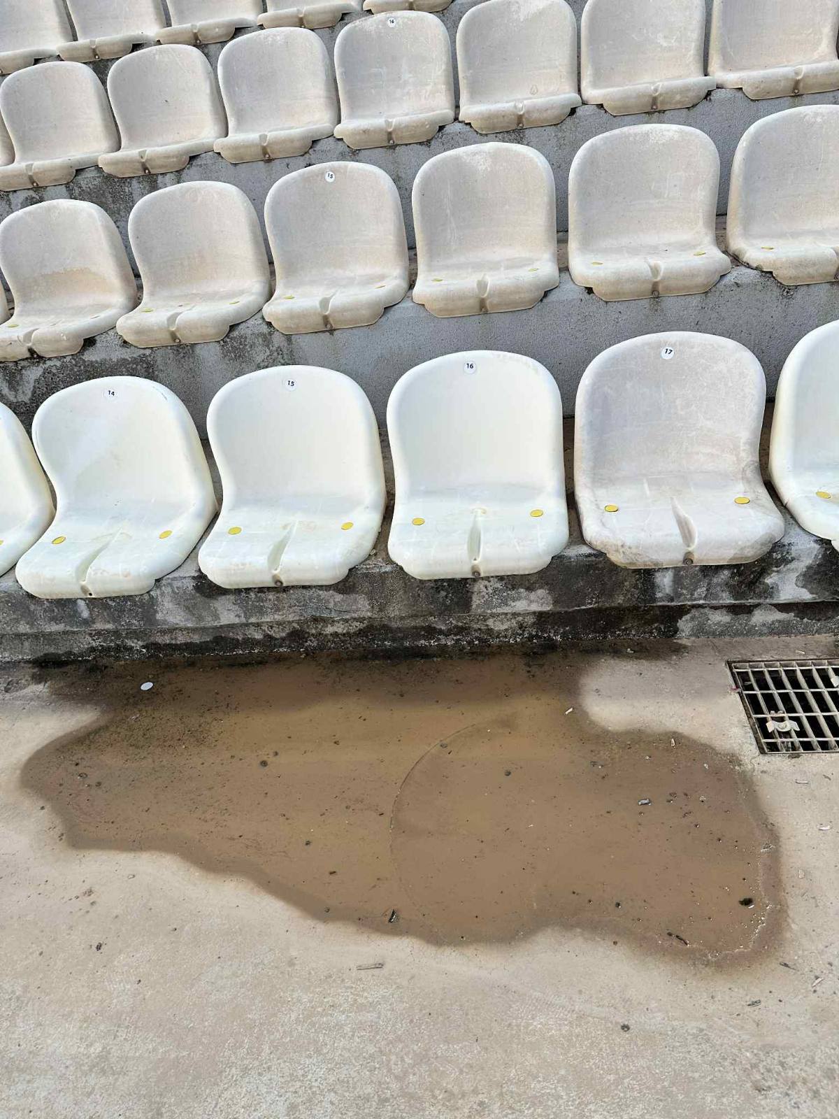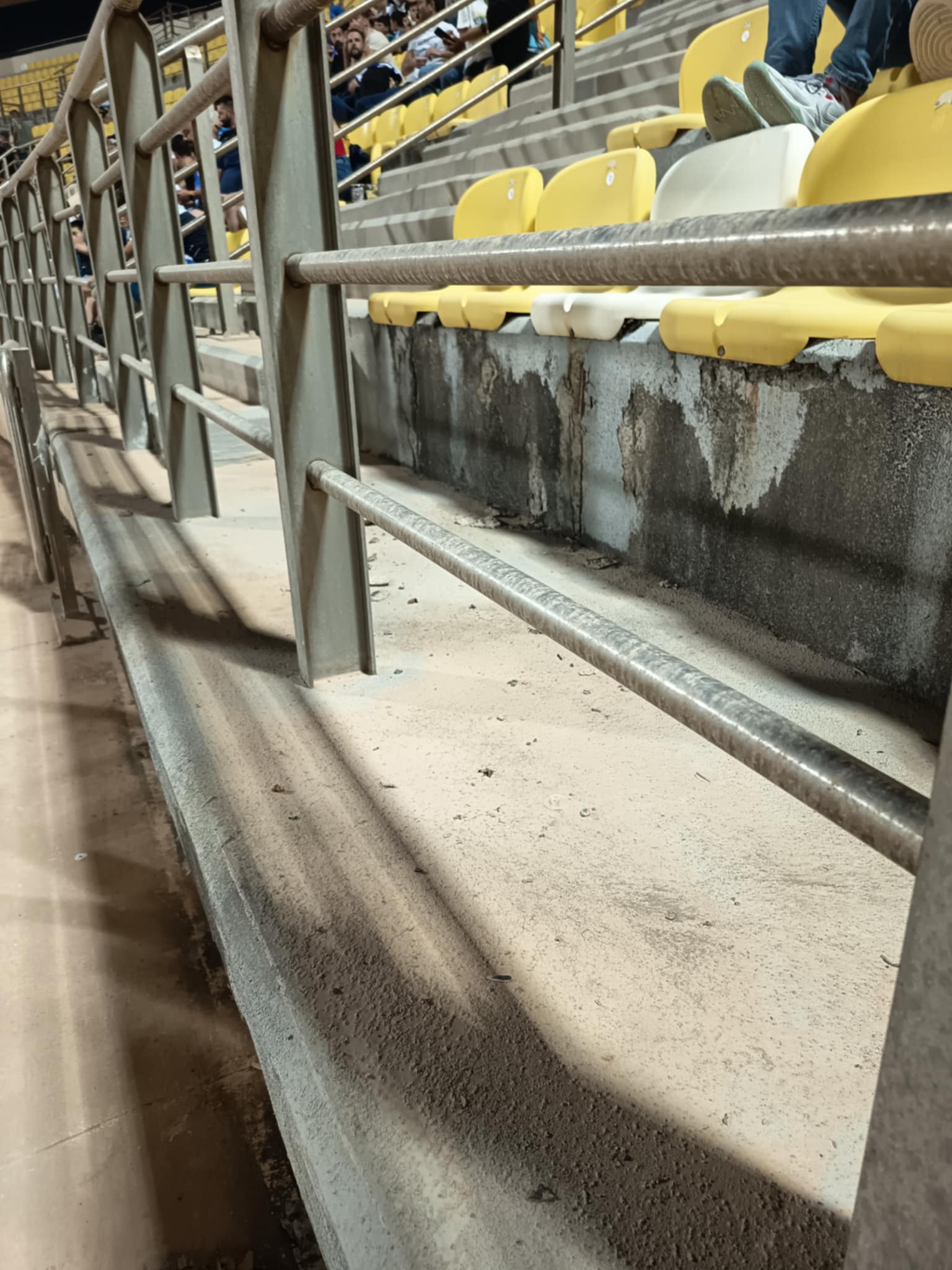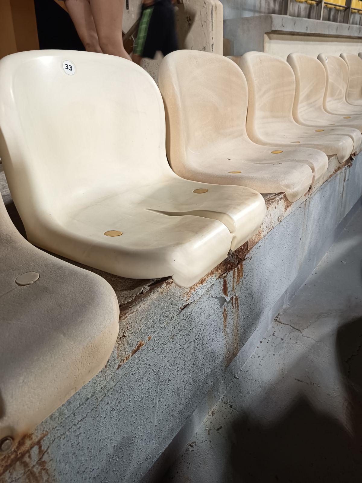 Η σκόνη απομακρύνθηκε από τα καθίσματα, αλλά έπεσε κατάχαμα, δίπλα από αυτά, δημιουργώντας ένα παχύ καφέ χωμάτινο “στρώμα” – το ίδιο βλέπαμε και στο στίβο. Ταίριαζε χρωματικά με τη σκουριά που έβγαζε… μάτι από σωληνώσεις, σκαλοπάτια, σίδερα κλπ. Οι δε τοίχοι του σταδίου ξεφλούδιζαν κι είχαν … σκάσει, όχι απ’ το κακό τους, αλλά από το χρόνο, την αλμύρα και την υγρασία!