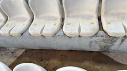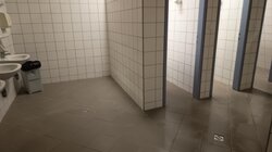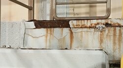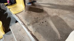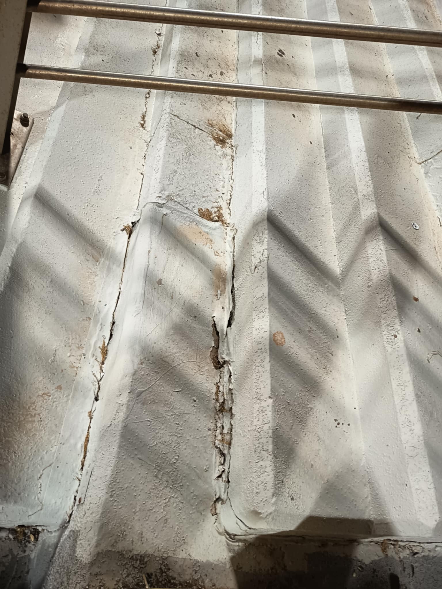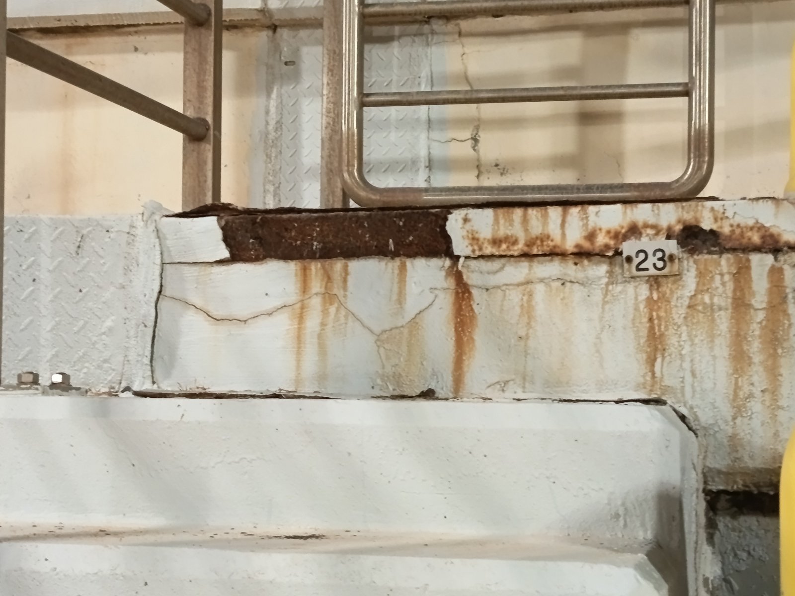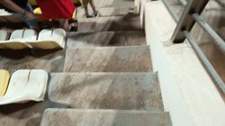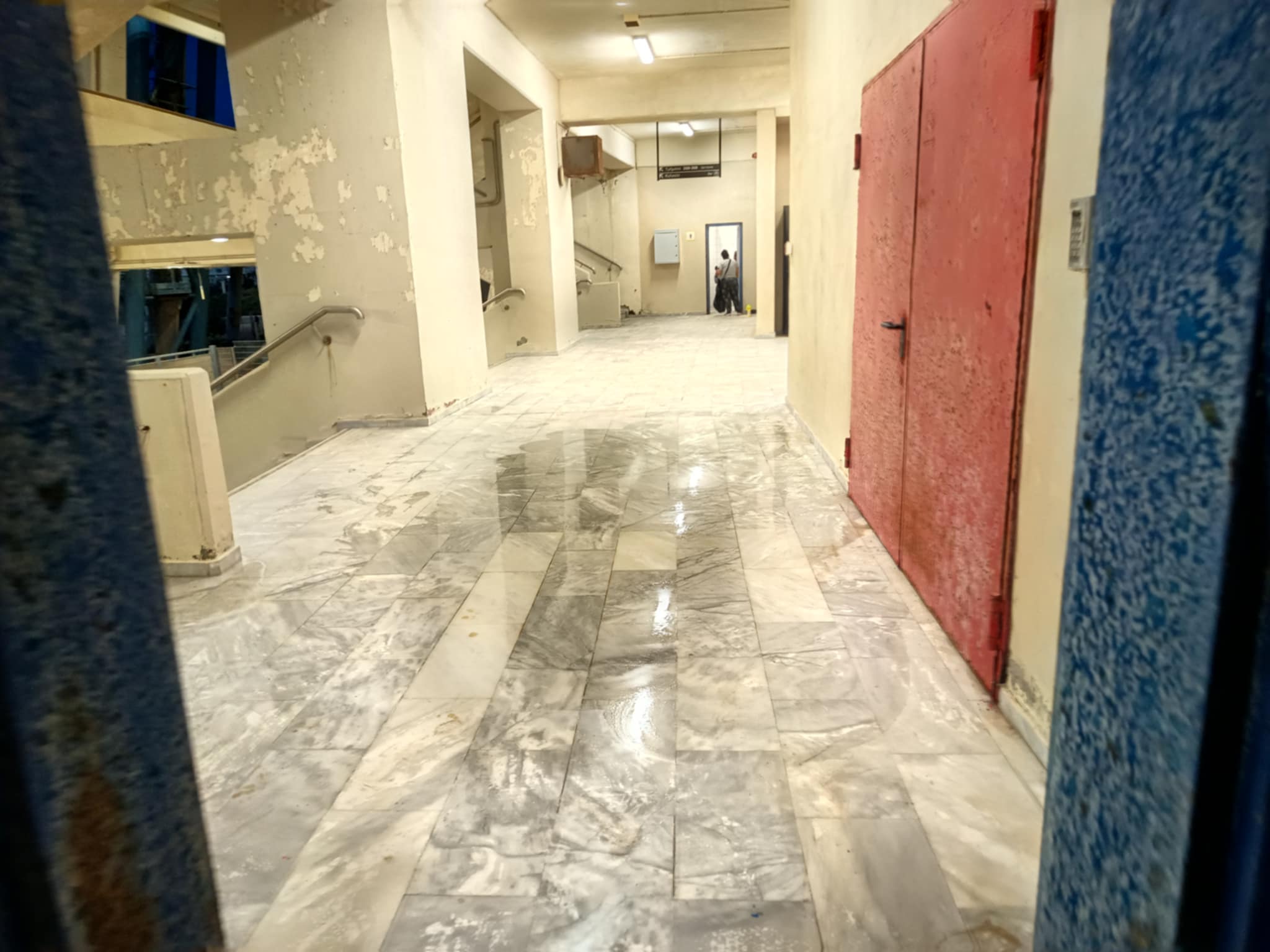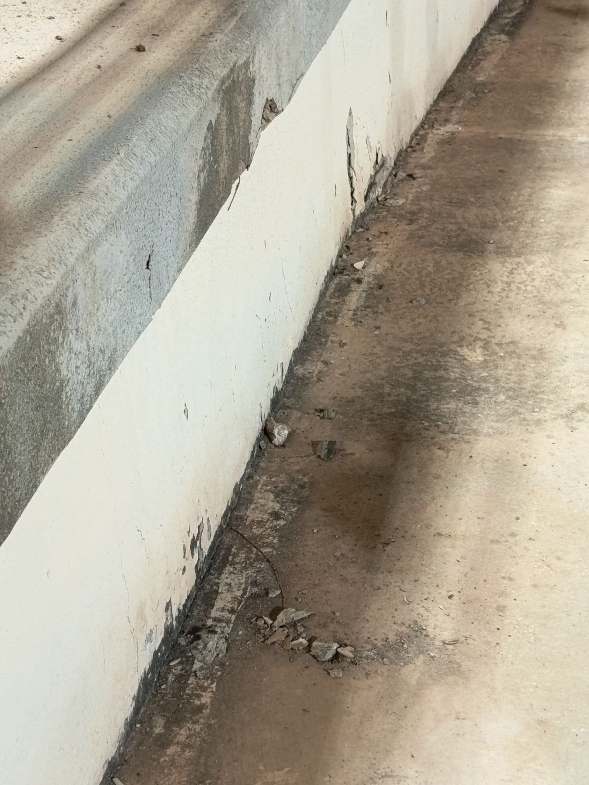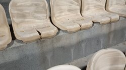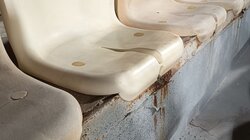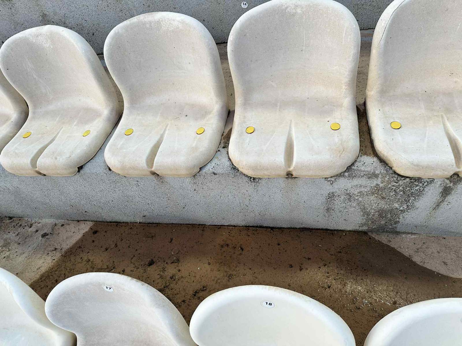 Η σκόνη απομακρύνθηκε από τα καθίσματα, αλλά έπεσε κατάχαμα, δίπλα από αυτά, δημιουργώντας ένα παχύ καφέ χωμάτινο “στρώμα” – το ίδιο βλέπαμε και στο στίβο. Ταίριαζε χρωματικά με τη σκουριά που έβγαζε… μάτι από σωληνώσεις, σκαλοπάτια, σίδερα κλπ. Οι δε τοίχοι του σταδίου ξεφλούδιζαν κι είχαν … σκάσει, όχι απ’ το κακό τους, αλλά από το χρόνο, την αλμύρα και την υγρασία!