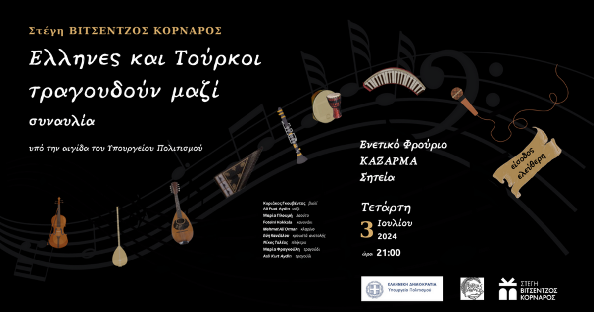 Έλληνες και Τούρκοι τραγουδούν μαζί στη Σητεία! Μια ξεχωριστή συναυλία όπου καταξιωμένοι Έλληνες και Τούρκοι καλλιτέχνες θα εμφανιστούν μαζί γιορτάζοντας τη δύναμη της μουσικής. Θα παρουσιάσουν αγαπημένα και κοινά τραγούδια και από τις δύο χώρες υπό τη διεύθυνση του μεγάλου Έλληνα βιολονίστα Κυριάκου Γκουβέντα.