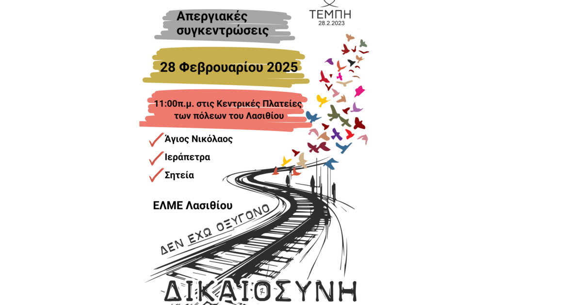 Η Γενική Συνέλευση της ΕΛΜΕ Λασιθίου στις 5 Φεβρουαρίου έπειτα και από την εισήγηση της ΟΛΜΕ, αποφάσισε ομόφωνα να συμμετέχει στην πανεργατική απεργία στις 28 Φεβρουαρίου 2025, ημέρα της μαύρης επετείου του σιδηροδρομικού εγκλήματος στα Τέμπη "για να αποδοθούν οι πολιτικές και ποινικές ευθύνες και να μην περάσει η προσπάθεια συγκάλυψης" - όπως αναφέρεται χαρακτηριστικά στη σχετική ανακοίνωση.