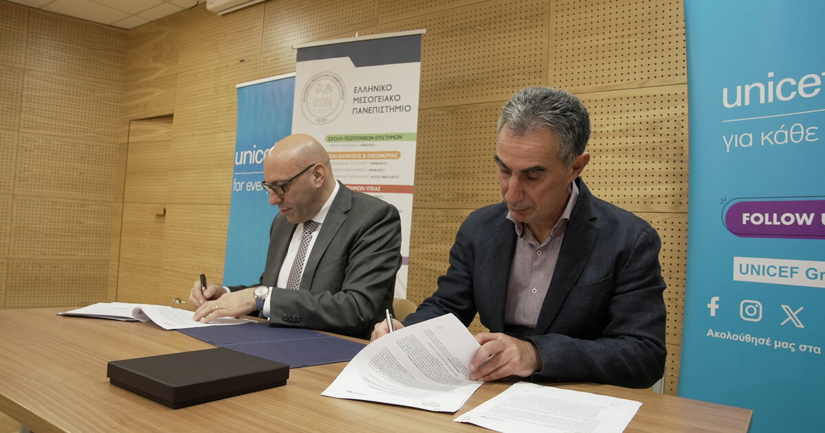 Μνημόνιο Συνεργασίας μεταξύ του Ελληνικού Μεσογειακού Πανεπιστημίου (ΕΛΜΕΠΑ) και της UNICEF υπέγραψαν ο Πρύτανης Καθηγητής Νίκος Κατσαράκης και ο Διπλωματικός Εκπρόσωπος της UNICEF στην Ελλάδα, Ghassan Khalil, την Τετάρτη 22 Ιανουαρίου 2025, στο Αμφιθέατρο Εκδηλώσεων της Σχολής Επιστημών Υγείας στην Πανεπιστημιούπολη Ηρακλείου.