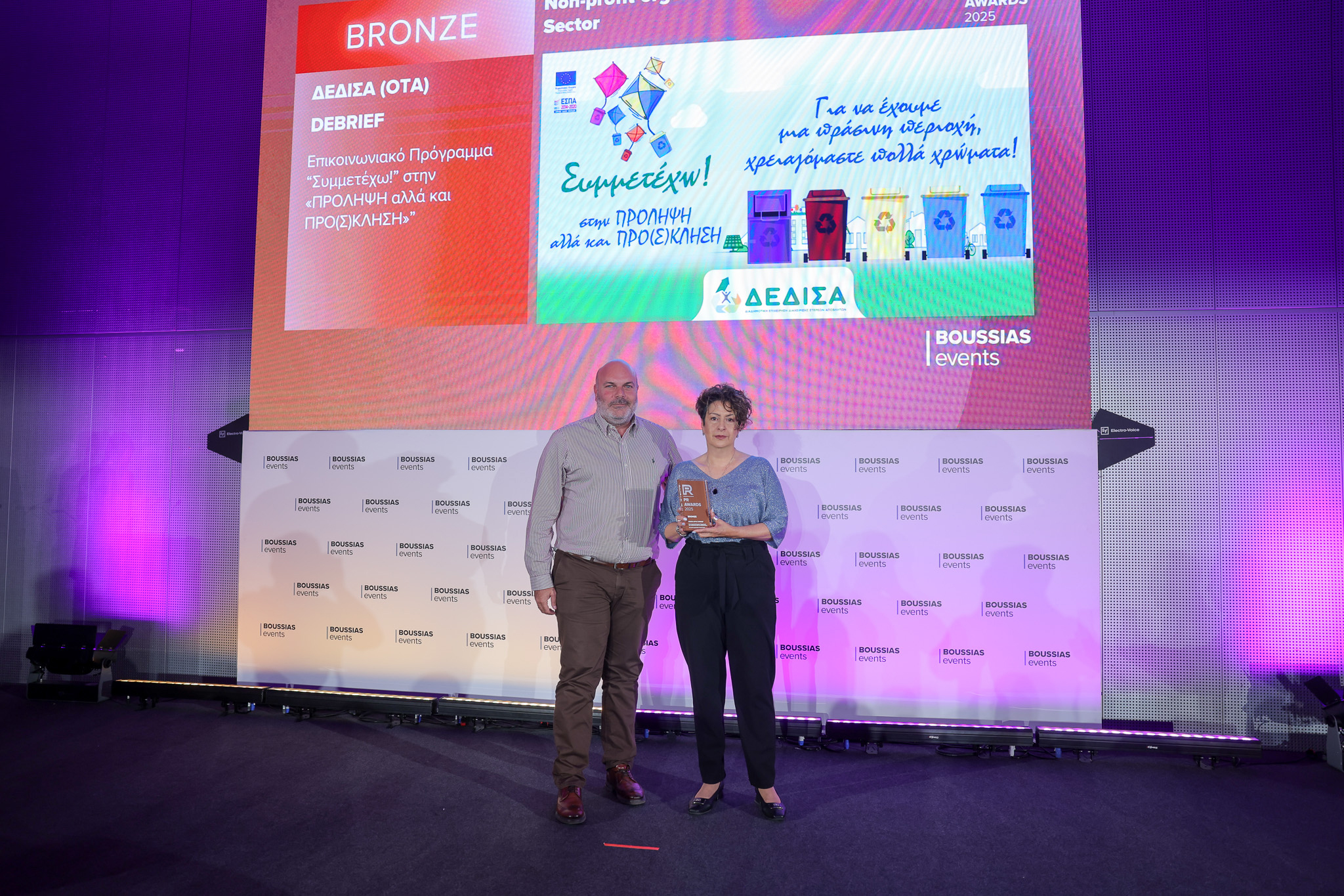 Τρίτη διάκριση για το Επικοινωνιακό Πρόγραμμα “Συμμετέχω!” έλαβε η Διαδημοτική Επιχείρηση Διαχείρισης Στερεών Αποβλήτων [ΔΕΔΙΣΑ Α.Ε. (ΟΤΑ)], η οποία βραβεύτηκε με το χάλκινο βραβείο στην κατηγορία «Best PR Campaign per Sector (Καλύτερη καμπάνια δημόσιων σχέσεων ανά κλάδο)». Η απονομή πραγματοποιήθηκε την Τρίτη 29 Απριλίου 2025 στην Αθήνα, στο πλαίσιο των PR Awards 2025, που αναδεικνύουν τις κορυφαίες στρατηγικές και τις πρωτοποριακές καμπάνιες που διαμορφώνουν το τοπίο της επικοινωνίας και των δημοσίων σχέσεων.