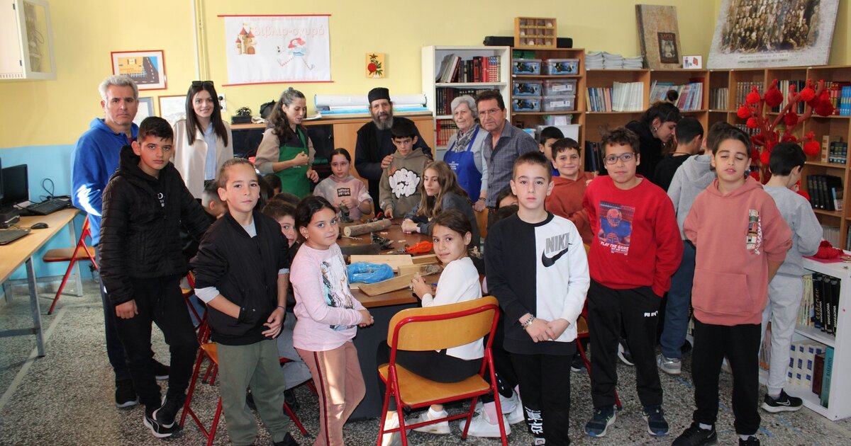 "Με μεγάλη χαρά υποδεχτήκαμε στο σχολείο μας τον παπά Μανόλη Καλαϊτζάκη, γλύπτη – ξυλογλύπτη - Ακαδημαϊκό και τους συνεργάτες του, για ένα βιωματικό μάθημα εργόχειρου, γλυπτικής και ξυλογλυπτικής στους μαθητές της Ε΄ και ΣΤ΄ τάξης.