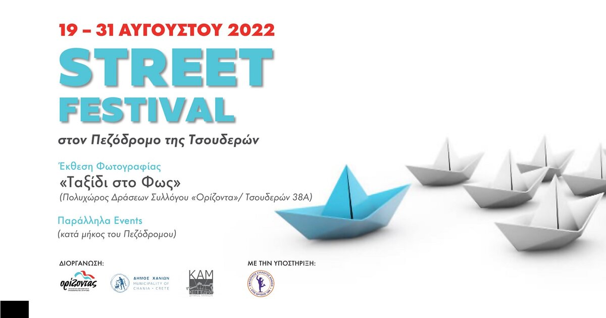 Ο Σύλλογος «Ορίζοντας» και ο Δήμος Χανίων διοργανώνουν STREET FESTIVAL με Έκθεση Φωτογραφίας στον Πολυχώρο Δράσεων του Συλλόγου «Ορίζοντα», στην Οδό Τσουδερών 38Α και διάφορα events κατά μήκος του Πεζόδρομου της Τσουδερών. Το Street Festival θα πραγματοποιηθεί από τις 19 έως τις 31 Αυγούστου 2022, με την υποστήριξη της ΚΕΠΠΕΔΗΧ ΚΑΜ και του Εμπορικού Συλλόγου Χανίων.