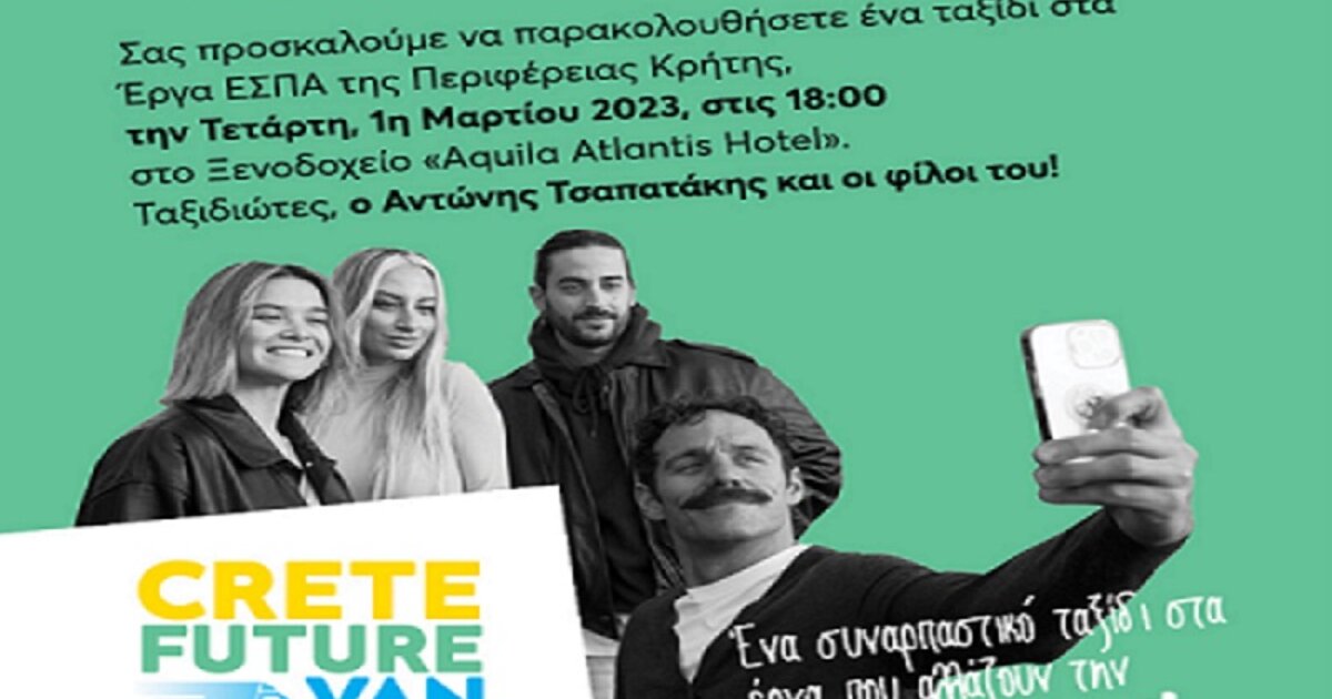 • θα προβληθεί το video του ταξιδιού, το οποίο καταγράφει όλες τις στάσεις του Crete Future Van στις Περιφερειακές Ενότητες Χανίων, Ρεθύμνου, Ηρακλείου και Λασιθίου. Ο «ξεναγός» Αντώνης Τσαπατάκης και οι συνταξιδιώτες του γνωρίζονται και συνομιλούν με τους υπεύθυνους των έργων ΕΣΠΑ, απολαμβάνοντας παράλληλα τη διαδρομή.