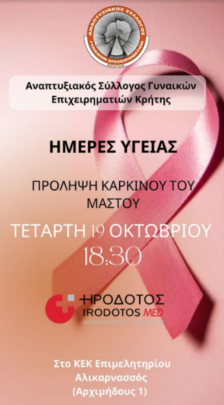 Στα πλαίσια του προγράμματος Ημέρες Υγείας του Αναπτυξιακού Συλλόγου Γυναικών Επιχειρηματιών Κρήτης σε συνεργασία με το Διαγνωστικό Κέντρο ΗΡΟΔΟΤΟΣ θα πραγματοποιηθεί ομιλία για την Πρόληψη του Καρκίνου του Μαστού την Τετάρτη 19 Οκτωβρίου 2022 στις 18:30, στο ΚΕΚ Επιμελητηρίου Αλικαρνασσού (Αρχιμήδους 1) .