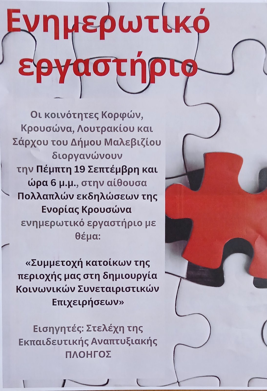 Οι τοπικές κοινότητες Κορφών, Κρουσώνα, Λουτρακίου και Σάρχου, του Δήμου Μαλεβιζίου, στοχεύοντας στην βιώσιμη ανάπτυξη της περιοχής τους και στην βελτίωση των κοινωνικών και οικονομικών συνθηκών, οργανώνουν σε συνεργασία με την εκπαιδευτική αναπτυξιακή «Πλοηγός» και με την υποστήριξη του Δήμου Μαλεβιζίου, ενημερωτικό εργαστήριο με θέμα: «Συμμετοχή των κατοίκων μας στην δημιουργία κοινωνικών συνεταιριστικών επιχειρήσεων».