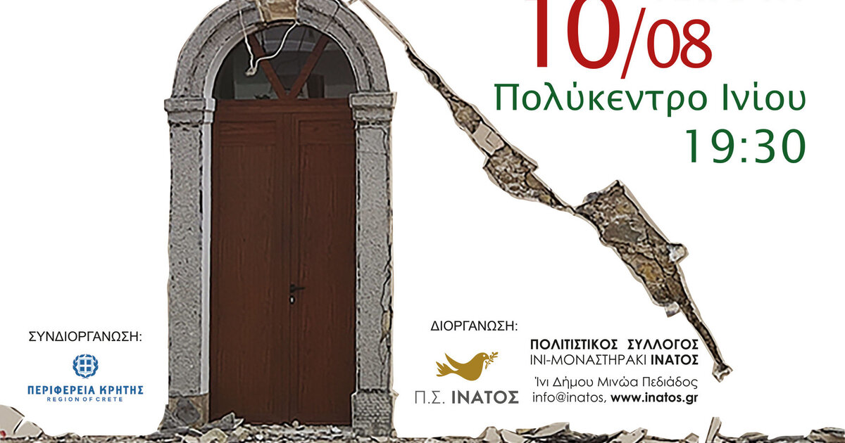 Ο Πολιτιστικός Σύλλογος ΙΝΙ-ΜΟΝΑΣΤΗΡΑΚΙ «ΙΝΑΤΟΣ», με συνδιοργανωτή την Περιφέρεια Κρήτης, πραγματοποιεί, αύριο Τετάρτη 10 Αυγούστου στο Πολύκεντρο Ινίου, στις 19:30, για ενημερωτική εκδήλωση για τους Σεισμόπληκτους: