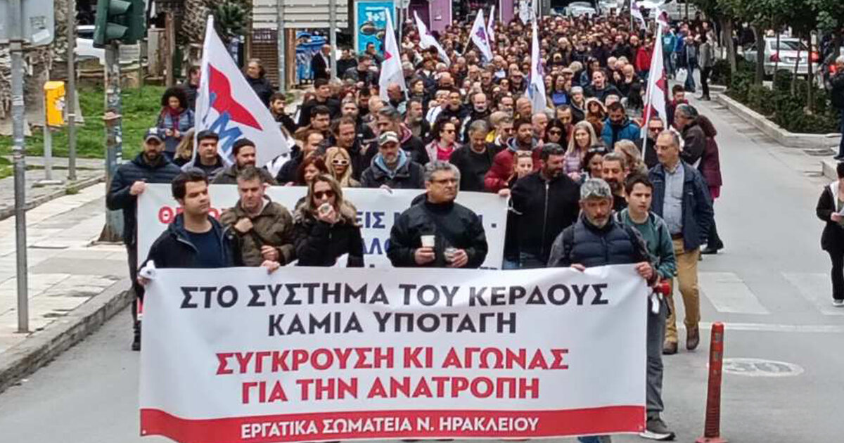 Η σημερινή απεργία και οι μαζική απεργιακή συγκέντρωση των συνδικάτων και των μαζικών φορέων στο Ηράκλειο αποτελεί συνέχεια των μεγάλων αγώνων για την ανατροπή της αντιλαϊκής πολιτικής που μας στερεί το οξυγόνο. Εκατοντάδες λαού διαδήλωσαν με το σύνθημα «Ή τα κέρδη τους ή οι ζωές μας» που γεννήθηκε μέσα στους αγώνες ενάντια στην πολιτική που θυσιάζει τις ζωές μας για να αυξάνονται τα κέρδη των επιχειρηματικών ομίλων, ενάντια στην πολιτική της απελευθέρωσης και των ιδιωτικοποιήσεων που γεννά νέα Τέμπη.
