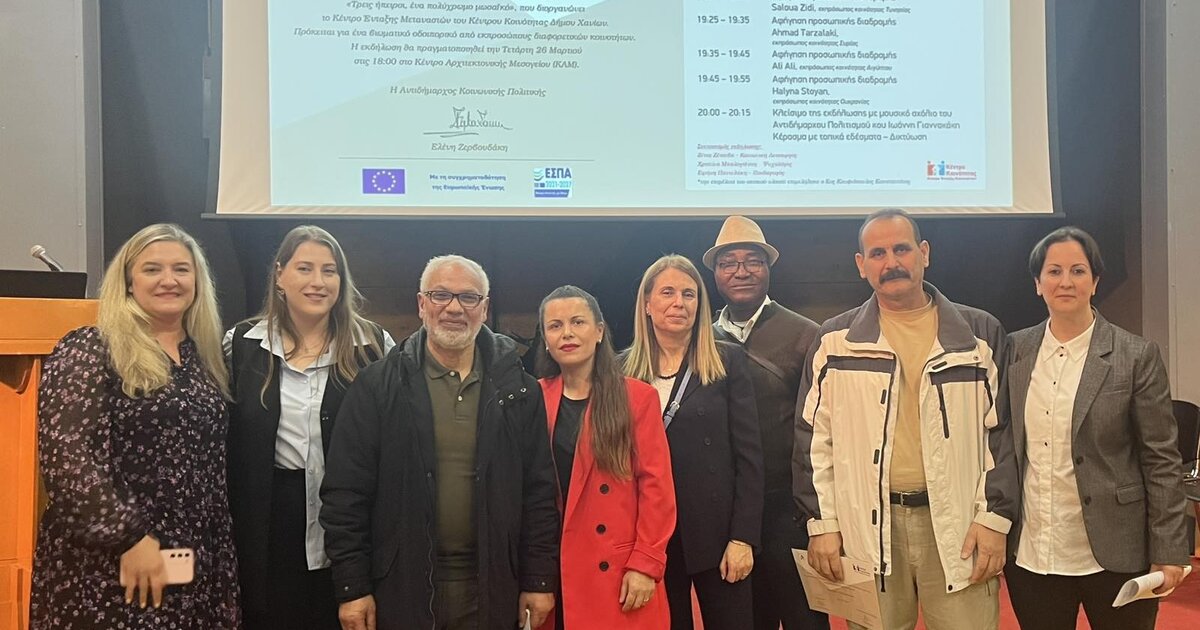 Με επιτυχία πραγματοποιήθηκε την Τετάρτη 26/3 στο Μεγάλο Αρσενάλι των Χανίων η πρώτη εκδήλωση του Κέντρου Ένταξης Μεταναστών της Διεύθυνσης Κοινωνικής Προστασίας του Δήμου Χανίων με τίτλο: «Τρεις Ήπειροι, ένα πολύχρωμο μωσαϊκό».