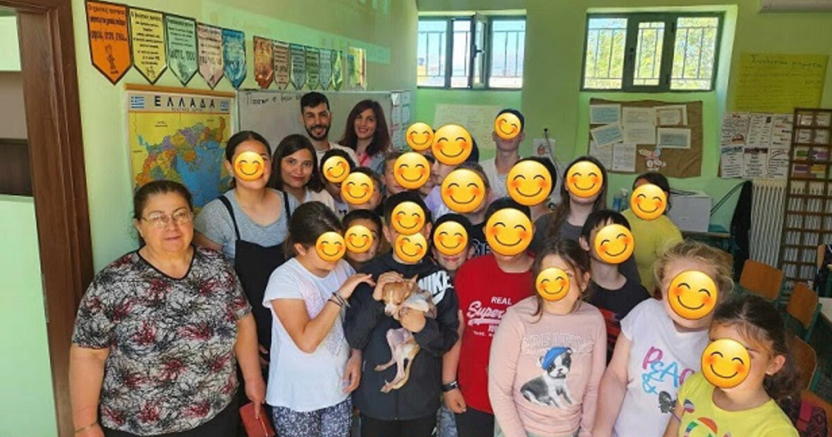 Τα 2 μέλη της φιλοζωικής οργάνωσης, επισκέφτηκαν το σχολείο, κρατώντας μαζί τους δύο σκυλάκια που είχαν κακοποιηθεί.